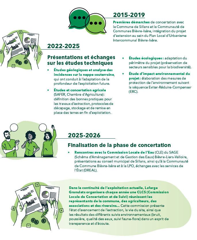Le projet d’extension de la carrière est le fruit de plusieurs années d’études et de discussions, menées avec les différents partenaires et acteurs du territoire : au fil des échanges, divers ajustements ont été apportés pour limiter les impacts du projet sur son environnement, en veillant à tenir compte des préoccupations locales.