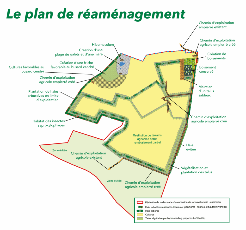 Le projet de réaménagement vise d’une part à restituer des terrains agricoles de qualité. La zone extraite sera en partie remblayée afin de recréer des espaces agricoles, en respectant les bonnes pratiques de la Chambre d’Agriculture. Certains cheminements agricoles seront déplacés et d’autres seront créés. D’autre part, il consistera à créer des habitats favorables et pérennes pour la biodiversité locale :